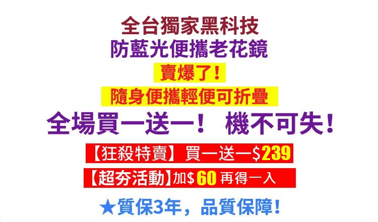 4分鐘前防藍光便攜老花鏡 火爆熱銷中!官方正品,免費試用,24小時在線客服,不好用直接退!售後無憂! - 【超值優惠】折扣價2入組NT$1198