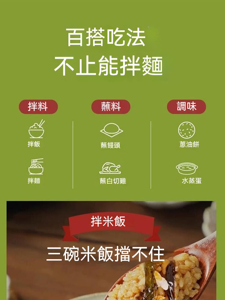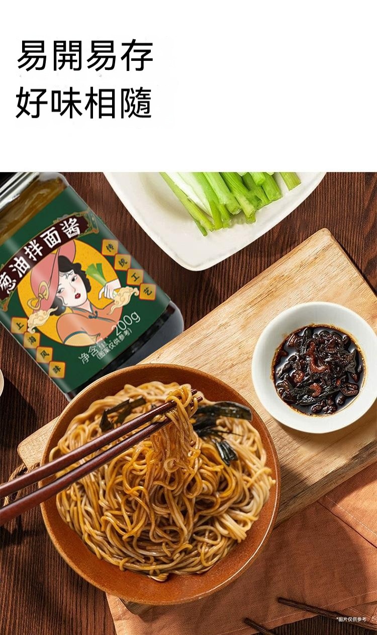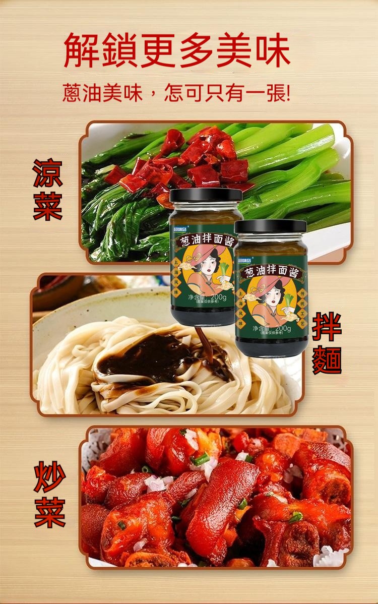 20分鐘前醇厚麵醬,完美搭配麵食,展現獨特風味 ,五分鐘就能吃上的蔥油拌面 ,無需繁瑣步驟 ,開瓶即食 油潤蔥香即刻享用 ,增鮮提香 ,秒變大廚 ,飯或者面都能一勺搞定 - 【98%客戶選擇】4入組-NT$1180